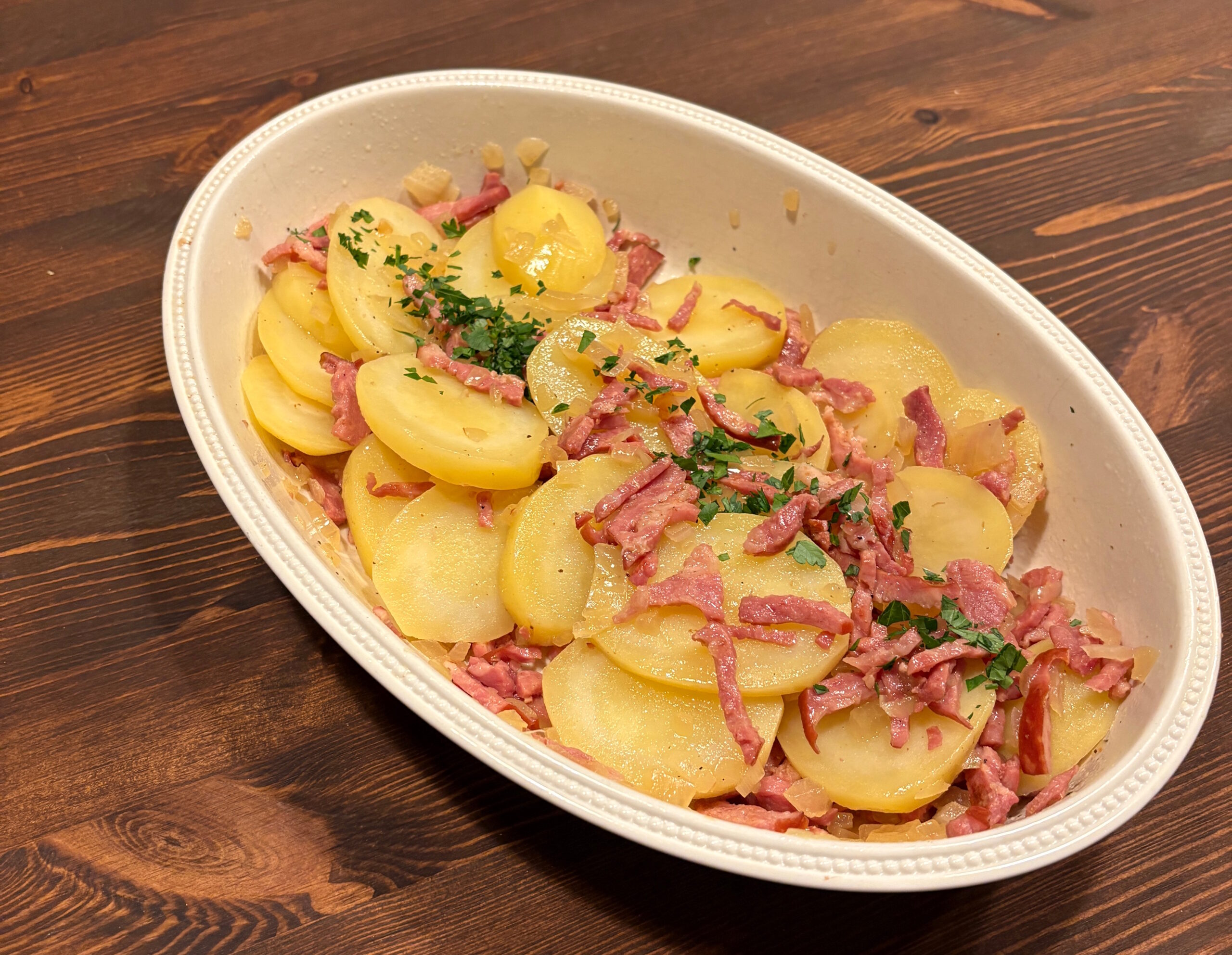 - Pel de aardappel, snij in plakken, leg uit in een bord. Bestrooi ruim met peper.