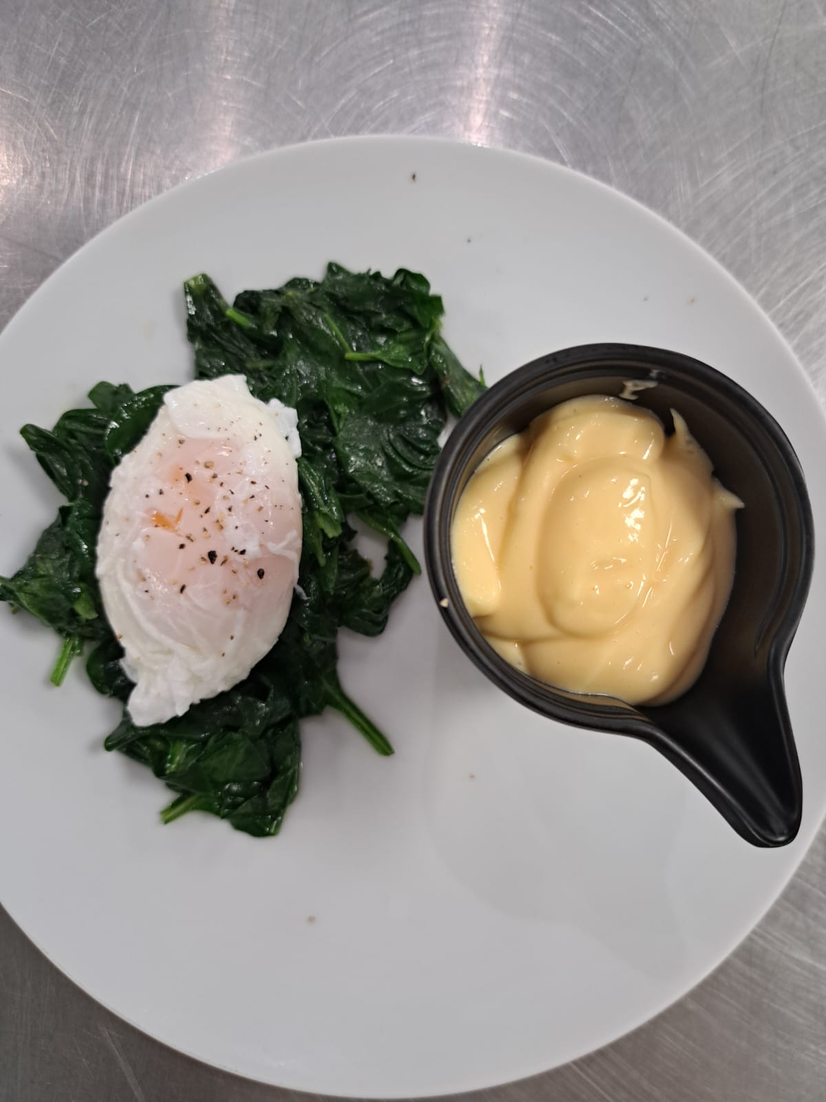 Verdeel de spinazie over 2 kommen, leg hierop een ei, verdeel de warme saus erover en garneer.