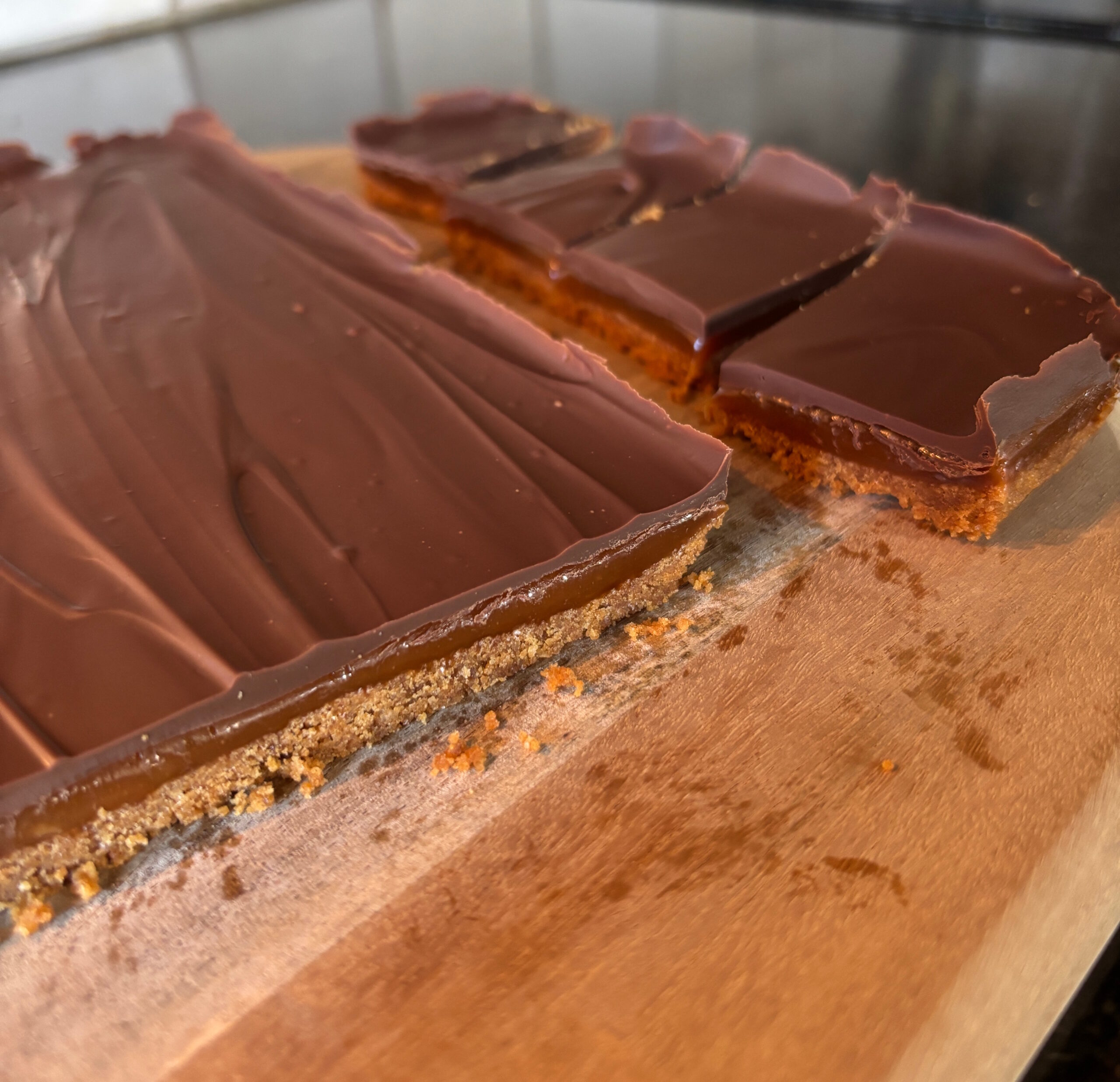 - Neem uit het bakblik en snij in stukken