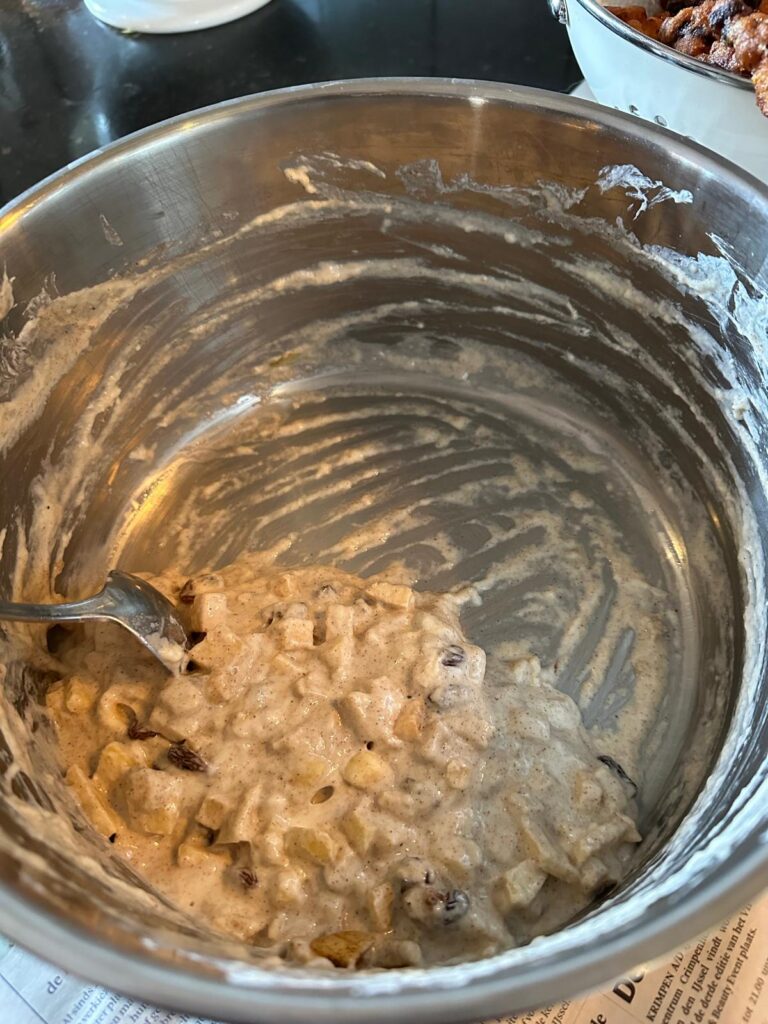 - Als het beslag gerezen is, kan het appel- kaneel- rozijnen mengsel erdoor geroerd worden. (zie foto onder)