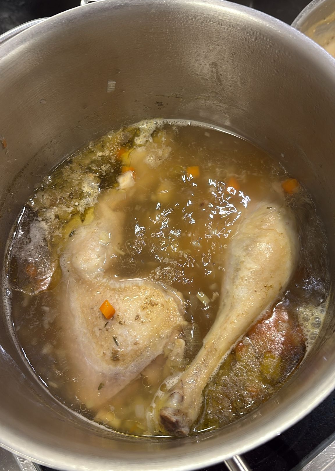 - Maak een kippenbouillon op basis van 500 g kippenpoten.