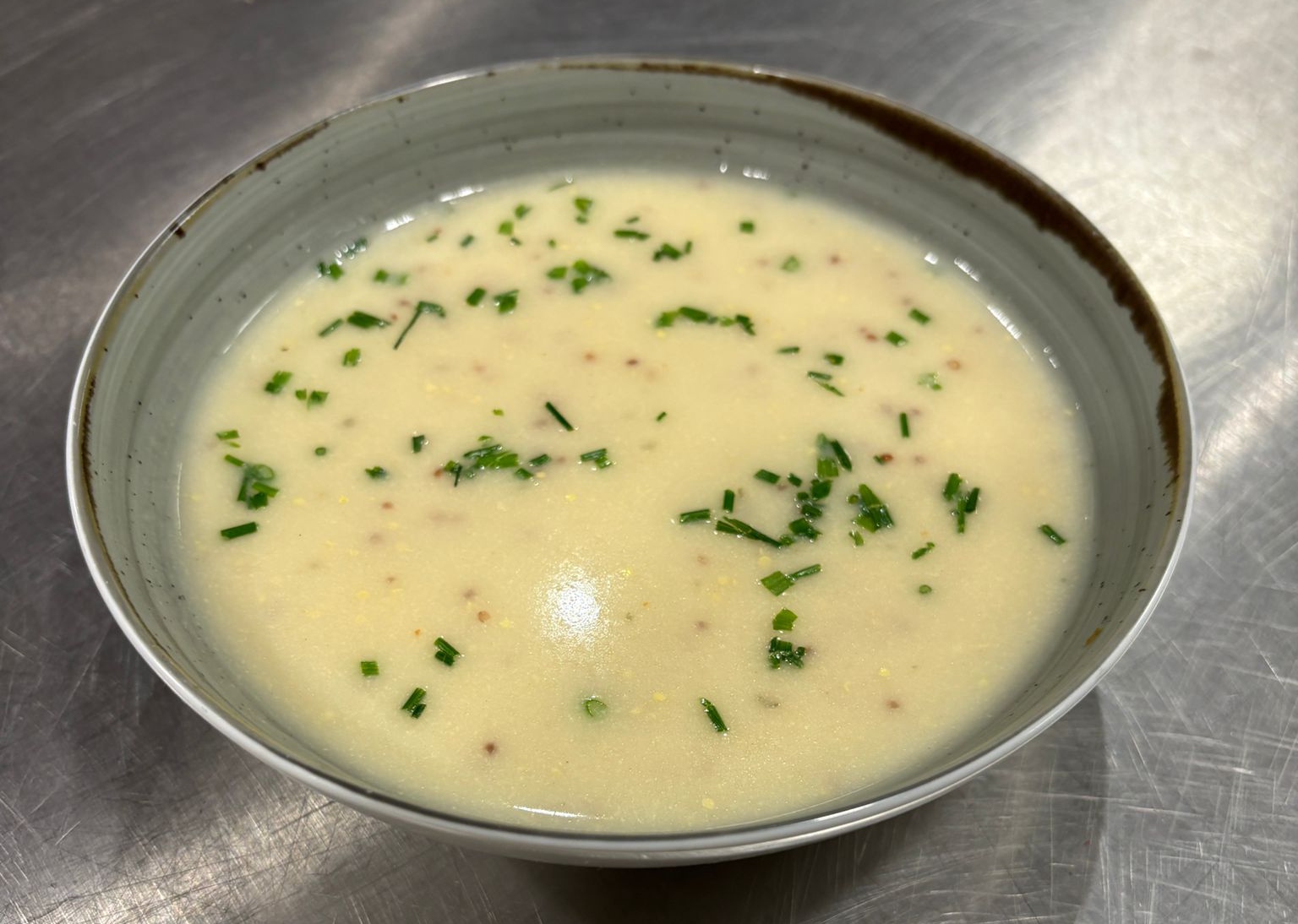 Blijf roeren totdat er een licht gebonden soep ontstaat. Voeg de room toe en breng op smaak met zout en versgemalen zwarte peper. Proef nog eens of het goed op smaak is en verdeel de soep over vier borden.